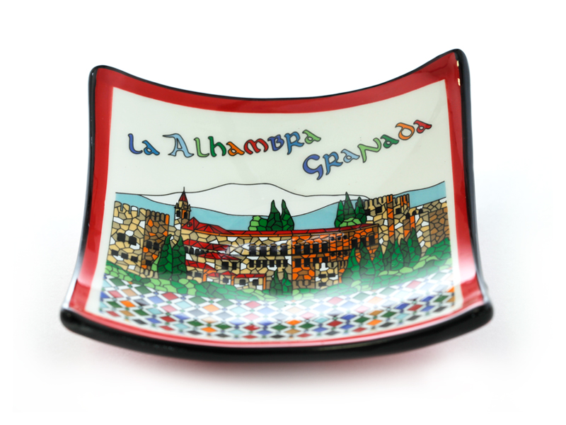 11 cm ceramic plate decorated with an illustration of the Alhambra, Granada’s emblematic monument. This plate, in beige tones with a red rim, features a handmade, hand-painted design that captures the majesty of the Alhambra surrounded by vegetation and with mountains in the background. The text “la Alhambra Granada”, in colorful calligraphy, complements the scene, along with a vibrant mosaic at the base, which adds a traditional Andalusian touch. Perfect as a souvenir or for decoration.