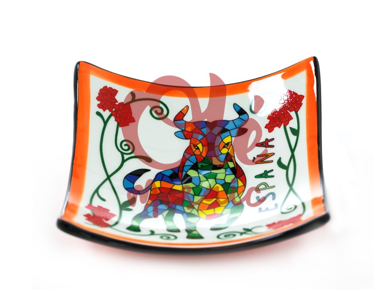 11 cm ceramic plate with a vibrant bull design, an iconic symbol of Spain. This plate, marked with the word “ESPAÑA”, displays a colorful mosaic in red, green, and blue tones, enhanced by an orange outline and decorated with floral elements. Its slightly curved shape and hand-painted artistic details make it an attractive souvenir that captures the essence of Spanish folklore, perfect for display or as a decorative piece.