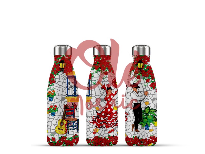 This elegant product is a 350 ml stainless steel bottle, adorned with vibrant scenes that reflect the authentic essence of an Andalusian patio. The decoration features a female flamenco dancer, dressed in a red polka-dot dress, in full motion, capturing the passion of flamenco. Beside her, a male flamenco dancer in traditional attire completes the scene, surrounded by flourishing flowerpots and other cultural elements that evoke the rich tradition and warmth of Spanish culture. Every design detail, from the lively colors to the intricate mosaic representing the patio, has been achieved with a meticulous illustration technique that makes this bottle stand out as an authentic Spanish souvenir. In addition to being a functional object, it represents a cultural memento that connects tourists with the vibrant Andalusian life.
