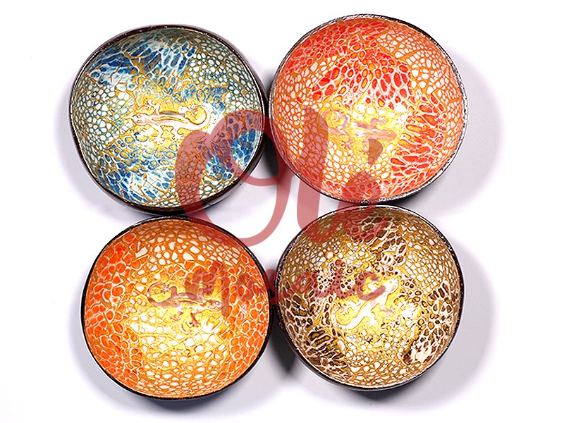 Coconut bowls, 13 x 6 cm, decorated with the distinctive salamander motif, a representation of traditional Spanish art. Each bowl features a unique, handcrafted design, hand-painted with vibrant colors such as blue, red, orange, and gold, with intricate details that evoke a natural and organic style. These elegant vessels are functional and, at the same time, add an artistic touch to the decor of any home or event.
