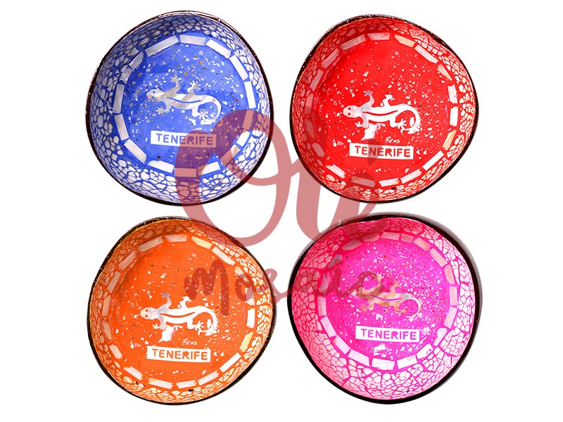 Set of 4 coconut bowls, each with a vibrant and colorful design representing the emblematic salamander, a symbol of Tenerife. With a diameter of 13 cm and a height of 6 cm, these bowls feature a handcrafted, hand-painted finish, adorned with bright red and blue, orange, and pink tones. The salamander motif is printed in the center, complemented by the name “Tenerife” in a prominent format, ideal for adding a Canarian touch to any table or decoration.