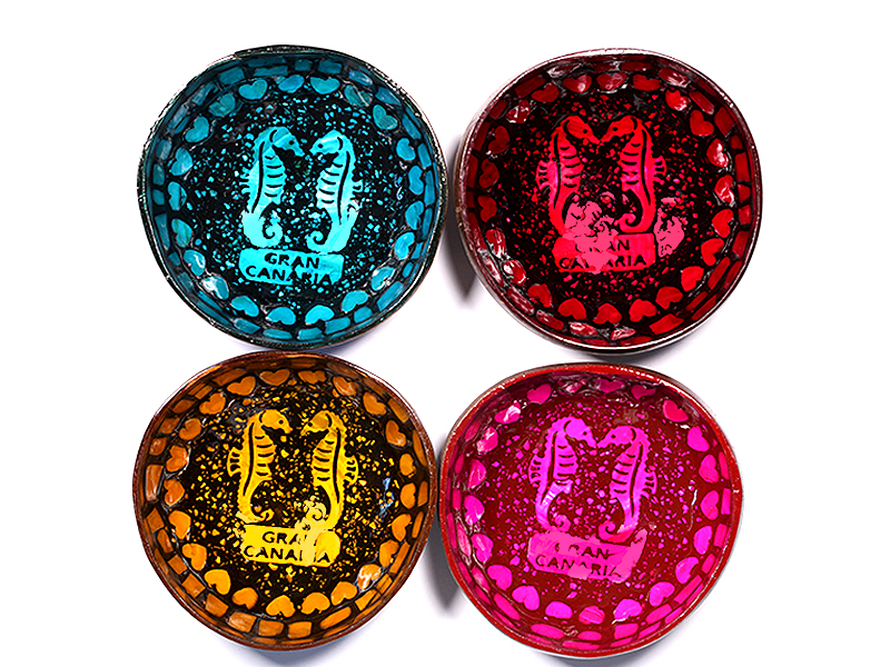 Set of 4 coconut bowls, 13 x 6 cm, decorated with seahorse illustrations, representative of Gran Canaria. Each bowl features a different vibrant color: blue, red, orange, and fuchsia, enhanced with hand-painted heart designs on the rim. The inscription “Gran Canaria” appears on each piece, capturing the essence of Canarian folklore and making this set an ideal option as a souvenir or decorative item.