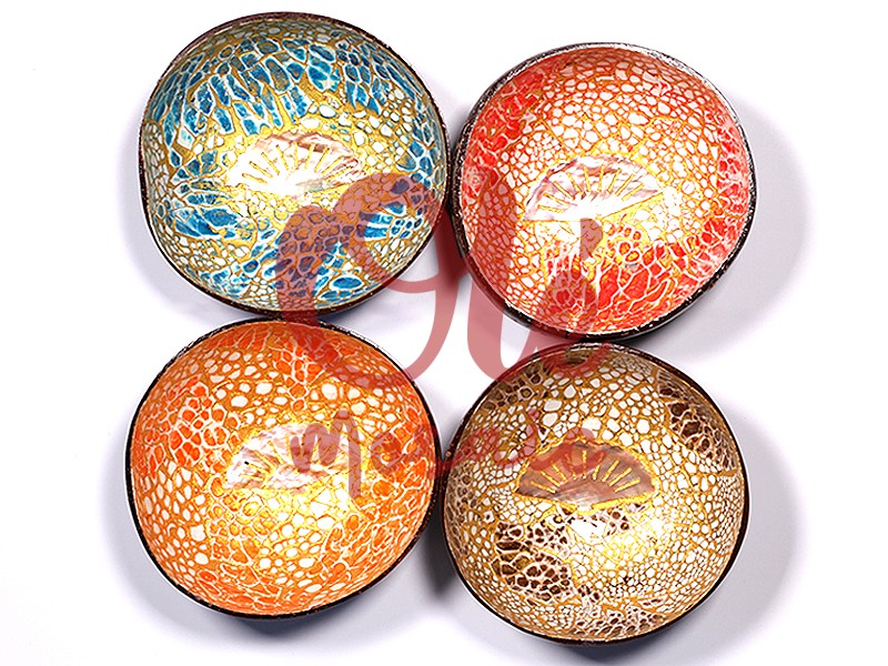 Set of 4 handcrafted natural coconut bowls, 13 x 6 cm, decorated with a fan motif in the center. Each bowl features a crackled design in vibrant tones such as blue, red, orange, and brown, on an iridescent golden background that stands out with a brilliant effect. Inspired by Mediterranean art and Spanish folklore, they stand out for their manual finish and unique visual texture that imitates mosaic.