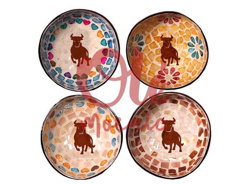 Set of 4 coconut bowls, 13 x 6 cm, decorated with motifs of the emblematic Spanish bull. Each bowl features a unique design, with vibrant colorful mosaics, including flowers and geometric shapes that enhance its visual appeal. The bulls, represented with a brown finish, stand out against a background of varied textures. This collection is perfect for adding a cultural and cheerful touch to any table or decorative space.