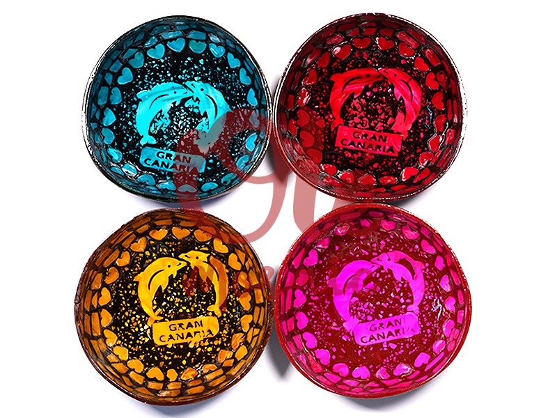 Set of 4 coconut bowls, 13 x 6 cm, decorated with friendly dolphins representing the natural beauty of Gran Canaria. Each bowl features a distinct vibrant color: blue, orange, red, and fuchsia, with a handcrafted, hand-painted design that includes hearts and the inscription “Gran Canaria”. These bowls are perfect for serving appetizers or as a decorative item, adding a colorful and cheerful touch to any environment.