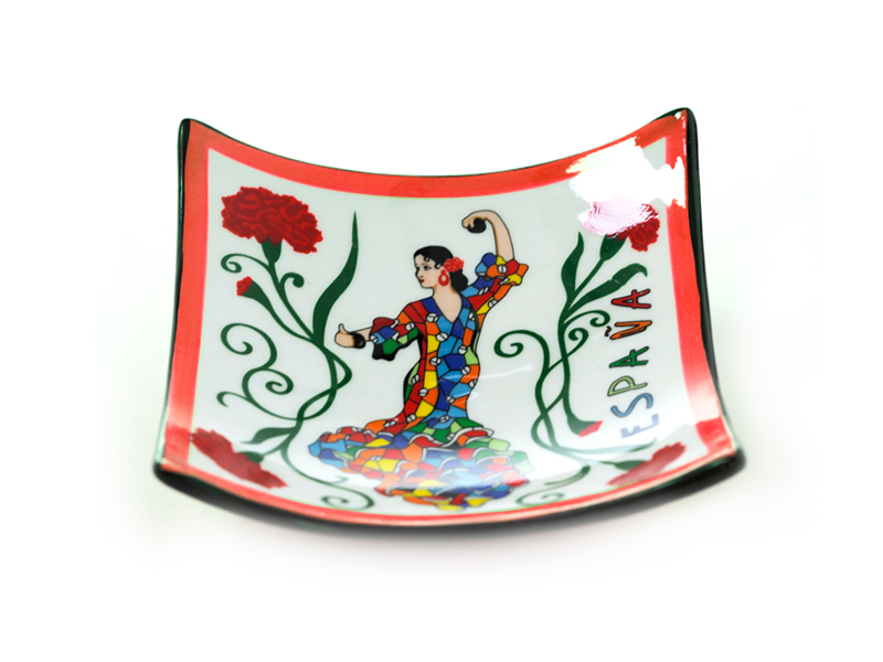 8.5 cm ceramic plate with a vibrant design that captures the spirit of flamenco. Hand-decorated in an artisanal style, it features a graceful flamenco dancer surrounded by floral elements in red and green tones. The rim of the plate is beige, further enhancing the vivid colors of the illustration and the flowers. It includes the word “ESPAÑA” (SPAIN), making it an attractive souvenir that represents Spanish culture. Ideal for display or as a decorative accessory.