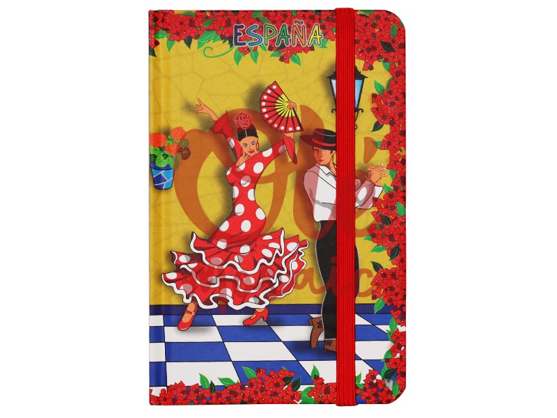 Discover our 80-sheet notebook, a charming souvenir that captures the vibrant essence of Spanish folklore through its captivating design. The cover features an illustration of a lively Spanish patio, adorned with red flowers that evoke the warmth of the Mediterranean climate. The design highlights a flamenco dancer, captivating spectators with an elegant red polka-dot dress and a fan carefully placed in her hand. Beside her, a male dancer complements the scene with a cheerful gesture, creating a festive atmosphere that represents rich Spanish culture.