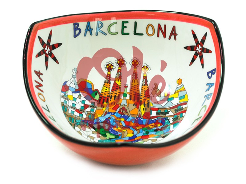 9.5 cm ceramic bowl with a vibrant panoramic view of Barcelona. This attractive bowl features a colorful representation of the Sagrada Familia and other emblematic monuments of the city, adorned with a mosaic design that captures the essence of Catalan modernism. The white interior contrasts with the red rim, while the inscription “Barcelona” and the decorative side details add a unique and authentic touch, ideal for lovers of this iconic city.