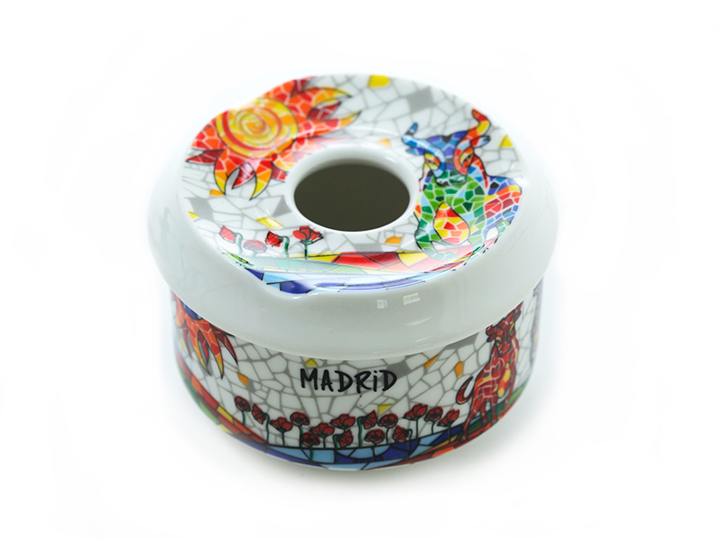 A 9 cm ceramic ashtray, decorated with bullfighting motifs that represent Madrid’s rich tradition. This attractive white ashtray features a colorful design with mosaics and floral details on the base, along with the “MADRID” inscription. Its glossy finish and rounded shape make it a practical and elegant object, ideal for adding a cultural and authentic touch to any space.