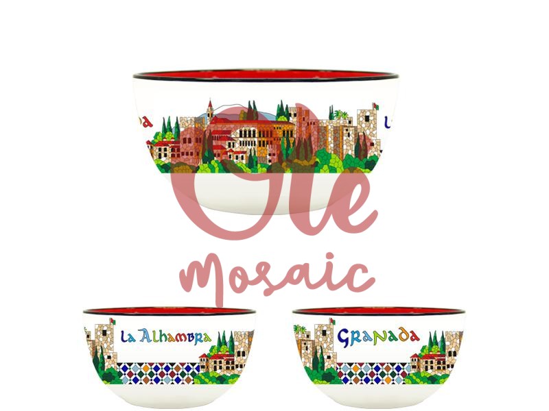 Discover the elegant 9 cm ceramic bowl inspired by the majestic Alhambra of Granada, an authentic jewel of Islamic art and a symbol of rich Andalusian culture. This attractive bowl features a vibrant illustration of the famous fortress, surrounded by its lush gardens, capturing the essence of one of Spain’s most emblematic monuments. Its decorative design includes a red border at the top, adding a touch of warmth and color, while the beige background highlights the intricate architectural details of the Alhambra.