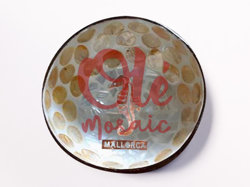 Beige coconut bowl decorated with an elegant seahorse, a symbol of Mallorca’s marine beauty. This attractive item, crafted from coconut shell, features an artistic design with motifs in beige and golden tones that imitate the shapes of seashells. The image of the seahorse, with a subtle shiny finish, enhances the connection with the ocean, making it an excellent souvenir of the Balearic island.