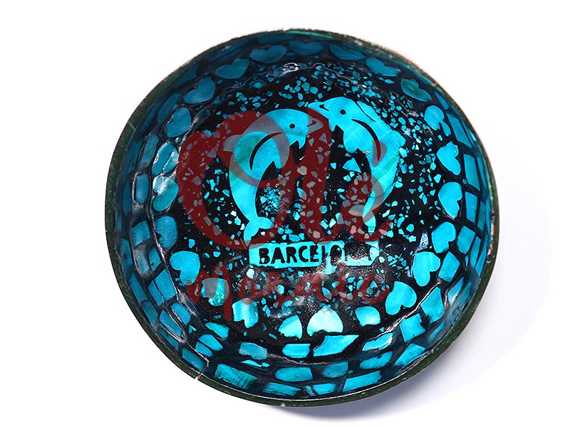 Blue coconut bowl decorated with dolphins, evoking the maritime spirit of Barcelona. This striking bowl features a vibrant design in blue tones, with a black background that enhances the image of two intertwined dolphins. The decoration, with small heart-shaped pieces, adds a playful and distinctive touch. Ideal as a decorative item or for daily use, this bowl combines art and functionality in a single product.