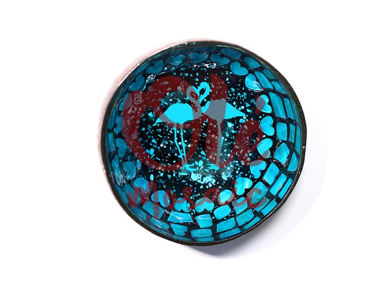 This blue coconut bowl, decorated with a charming flamingo motif, is a unique piece that adds a touch of color and style to any home. Handcrafted from coconut material, it stands out for its vibrant design in blue and black tones, fusing modernity with artisanal tradition. The interior of the bowl features an intricate decorative motif where elegantly painted flamingos rise against a blue background, surrounded by small heart-shaped details that add a playful and romantic element.