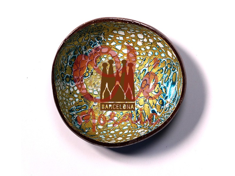Decorative coconut bowl in blue and gold tones, inspired by Barcelona’s emblematic Sagrada Familia. This elegant bowl features unique textures and a shiny finish, with a design that captures the architectural essence of the monument. The interior displays a beautiful mix of blue and gold, while the exterior shows the natural coconut finish. Ideal for serving or as a decorative piece, it evokes the city’s rich culture.