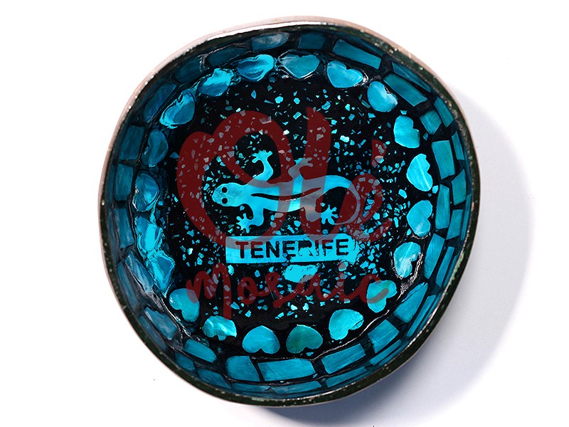 Blue coconut bowl, decorated with an elegant salamander representing the distinctive character of Tenerife. This attractive, handmade item features a brilliant finish with a mosaic design in blue tones and sparkles that evoke the island’s natural environment. The salamander, a symbol of local fauna, stands against a black background, alongside the text “TENIFERFE”, further enhancing its cultural connection. Perfect as a decorative item or for serving appetizers.