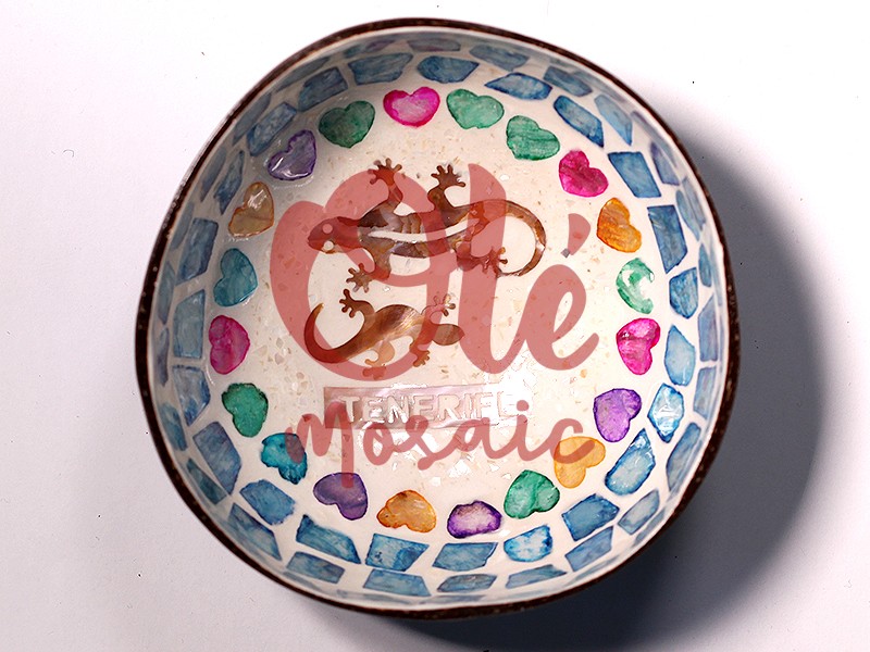 Blue coconut bowl decorated with a charming illustration of salamanders, typical of Tenerife. This handcrafted product stands out for its artisanal, hand-painted design, featuring a blue-toned rim and a background adorned with vibrant colorful hearts. In the center, salamanders coexist with the inscription “TENERIFE”, highlighting the island’s cultural richness. Ideal for adding a Canarian touch to your home or as a unique souvenir.