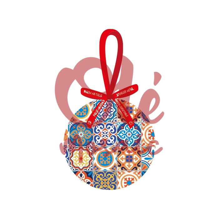 Decorative Christmas ball with box, inspired by mosaic art. This charming ornament features a colorful design combining blues, oranges, and earthy tones, imitating traditional ceramic patterns. The ball, accompanied by a red ribbon with festive inscriptions, is perfect for adorning the tree and adding a cultural and cheerful touch to celebrations. Ideal for lovers of craftsmanship and Christmas decoration.
