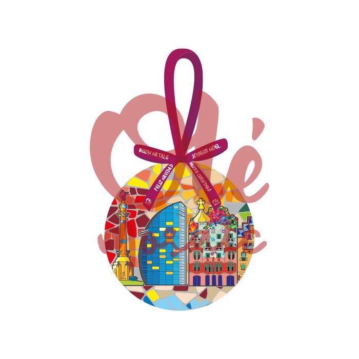 This decorative Christmas bauble is the perfect gift to evoke the festive spirit of Barcelona. Presented in an elegant box, this ornament stands out for its vibrant and colorful design, which captures the unique essence of the Condal City. Its surface is adorned with a brilliant mosaic that includes a representation of the iconic W hotel, known as one of Barcelona’s architectural jewels, as well as elements of the distinctive modernist style that characterizes the city.