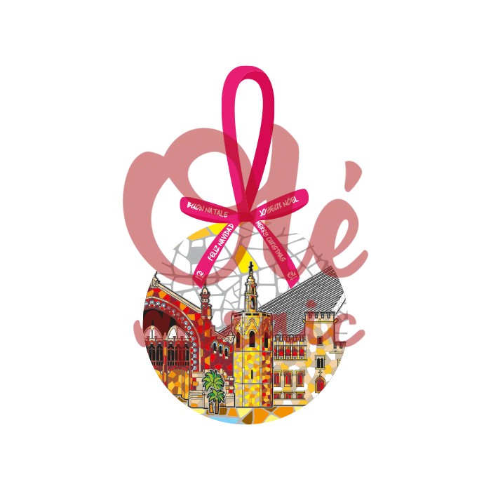Christmas bauble with a box featuring a charming panoramic view of Valencia. This Christmas ornament combines iconic architectural elements, such as the Lonja de la Seda and the Cathedral, highlighting their vibrant colors in a contemporary style decoration. Crafted from ceramic, its surface includes artistic details reminiscent of Valencian mosaic. The bauble is completed with a fuchsia ribbon, ideal for enhancing the magic of Christmas in your home.