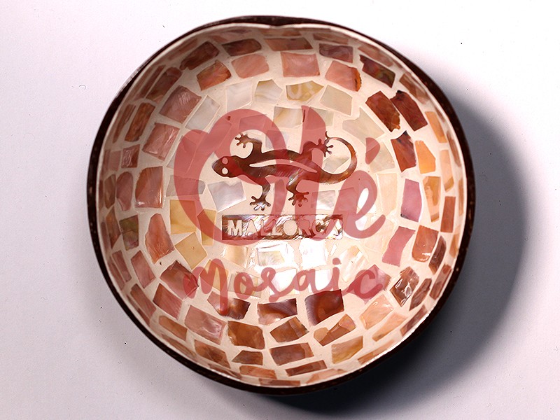 This brown coconut bowl, decorated with an elegant salamander design, is an authentic symbol of Mallorca’s Mediterranean fauna. Meticulously crafted, its surface is adorned with shells in soft beige and pink tones that form a beautiful mosaic, where the salamander figure stands out in the center, accompanied by the word “MALLORCA”, highlighted with a clear finish. This bowl is not only visually attractive but also has a smooth texture and a subtle sheen, making it a unique piece, both for serving appetizers and for decorating any home.