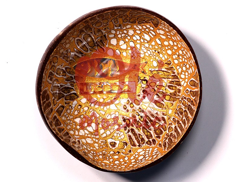 Brown coconut bowl decorated with a sardine design, representing Lisbon’s fishing tradition. This elegant bowl features a golden-toned finish and an intricate pattern that evokes the texture of a seashell. The image of the sardine and the word “LISBOA” stand out with a metallic tone, adding a distinctive touch. Ideal as a decorative piece or for serving appetizers, it combines functionality and art in an authentically Portuguese piece.