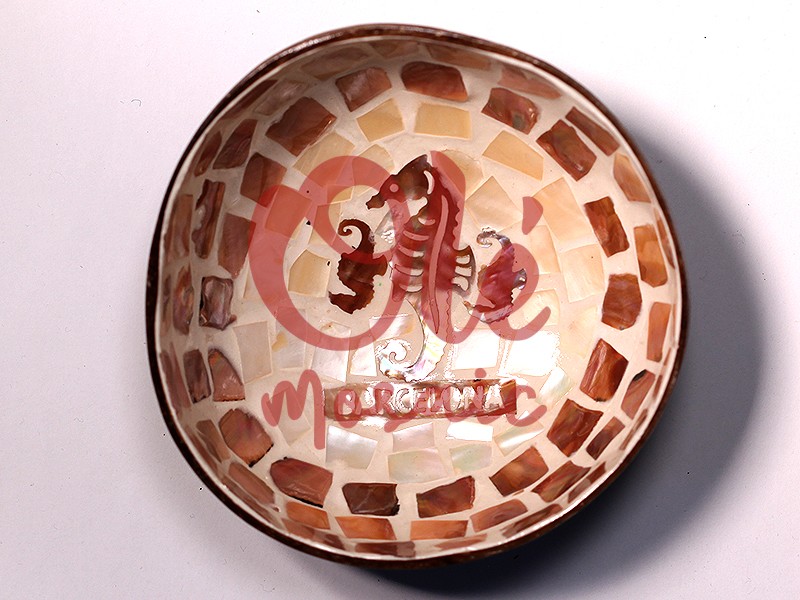 Brown coconut bowl with an elegant seahorse design, evoking the maritime essence of Barcelona. Handcrafted, it features mosaic decoration in brown and cream tones, with the seahorse figure highlighted in the center and the inscription “Barcelona”. This bowl, combining aesthetics and functionality, adds a distinctive and cultural touch to any space, ideal as a souvenir or decorative piece.