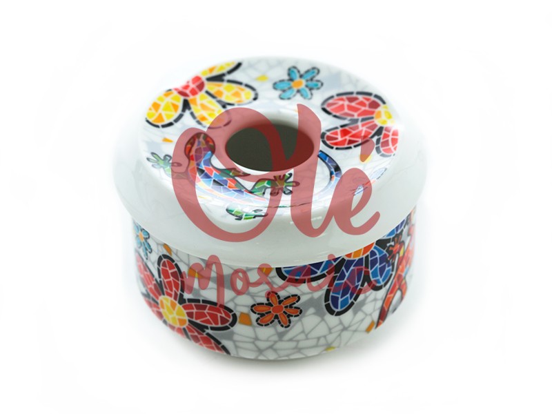 The salamander elegantly integrates into a background of stylized flowers, celebrating the beauty of the natural environment, while the vivid colors reflect the cheerful local culture. This ashtray is not only functional but also serves as a work of art that captures the essence of travel memories. At Olé Mosaic, we specialize in the distribution of authentic and quality souvenirs, and this ceramic ashtray is an excellent option for tourist gift shops wishing to offer unique products representative of Spanish craftsmanship. Without a doubt, an ideal gift for those who appreciate art and tradition.