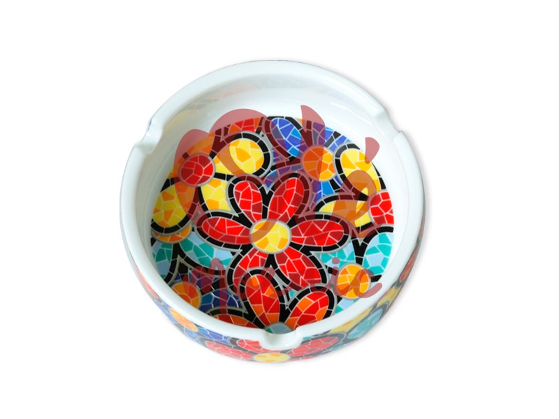 An 8 cm ceramic ashtray, decorated with a vibrant floral design. This elegant ashtray features a white base that enhances the colorful mosaics of red, yellow, blue, and green flowers, meticulously hand-painted. The detailed floral art adorns its interior, creating a distinctive piece that reflects the spirit of Mediterranean culture. Ideal for adding a touch of color and style to any space.