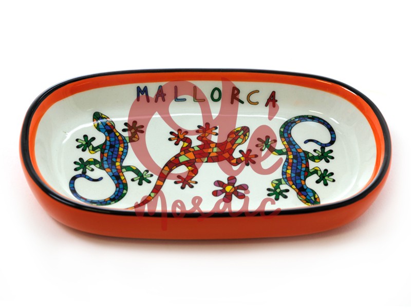 13.5 cm ceramic bowl inspired by Mallorcan fauna, with a charming design of multicolored salamanders. This elegant bowl, with an imposing oval shape and beige background, highlights ornamental motifs in vibrant tones and decorative flowers. The word “MALLORCA” is printed in a casual style, complementing its visual appeal. Ideal as a decorative piece or for practical use, it adds a Mediterranean touch to any home.