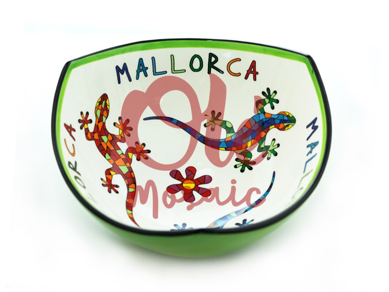 This 9.5 cm ceramic bowl is decorated with charming salamanders, representing the spirit of Mallorca. This colorful bowl features a vibrant, geometric design with salamanders in red, blue, and green tones, surrounded by flowers and the word “MALLORCA” printed. The exterior is bordered in a deep green, while the interior is white, creating an attractive contrast. Ideal as a decorative item or for serving appetizers.