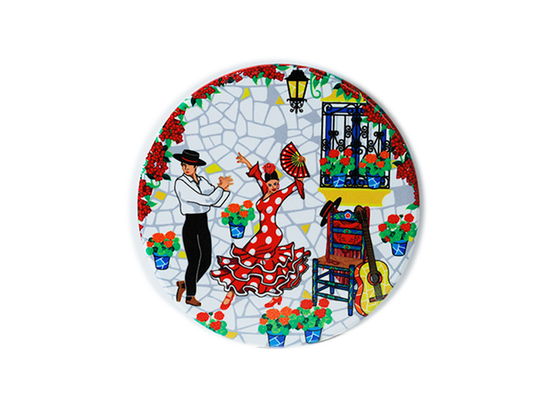 Ceramic coaster illustrated with a vibrant flamenco dance scene in an Andalusian patio. This colorful coaster features a pair of dancers; she, in a traditional red polka-dot dress, and he, in a wide-brimmed hat, accompanying her in the dance. Decorated with colorful flowers in pots and a mosaic background, this item combines art and functionality, adding a cultural touch to any table.