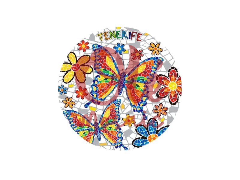 This ceramic coaster, with its vibrant butterfly design, is an authentic reflection of Tenerife’s natural beauty. Its round shape is adorned with colorful butterflies in shades of red, yellow, blue, and green, which seem to come to life against a textured background that mimics a delicate mosaic. The floral decoration surrounding the butterflies adds a cheerful and fresh touch, evoking the exuberance of the Canarian flora, so typical of the island. At the top, the word “TENERIFE” stands out with an attractive design, linking this souvenir to one of the most beautiful destinations in the Canary Islands archipelago.