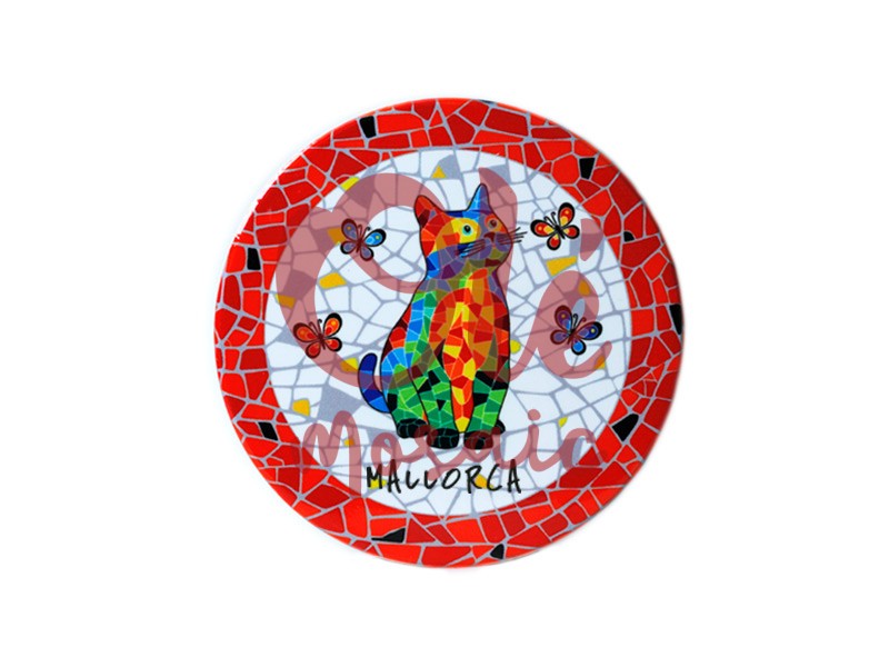 This ceramic coaster is a sunny representation of the spirit of Mallorca, evoking the joy and beauty of the island. Featuring a colorful cat as its protagonist, this item stands out for its vibrant and artistic design, inspired by the daily life of the region. The cat, with its mosaic fur in shades of blue, green, and orange, sits on a mosaic background reminiscent of Mallorca’s lively streets and squares. Around this charming feline, small red and blue butterflies add a touch of dynamism, creating an atmosphere of freshness and vitality.