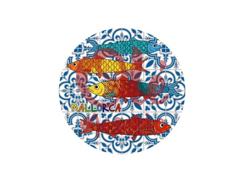 This round ceramic coaster is a vibrant representation of Mallorca’s seafaring tradition, designed to brighten any setting. With a white and blue tile background, it evokes the essence of the Mediterranean, while four colorful sardines swim cheerfully on the surface. Each sardine is crafted with a captivating artistic style, using vivid shades of blue, red, yellow, and green that contrast wonderfully with the base. The word “MALLORCA” stands out at the bottom, adding an authentic and local touch that will make this item a memorable souvenir of the island.
