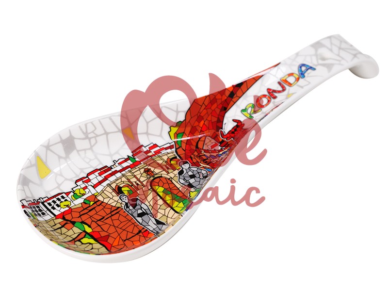 Handcrafted ceramic ladle, hand-painted, inspired by the beautiful city of Ronda. This elegant utensil features a vibrant illustration that captures the essence of its panoramic views, with details of its famous bridge and scenes of local life. With a mosaic design in red, green, and yellow tones on a white background, it is both functional and decorative, ideal for adding a touch of Andalusian culture to your home.