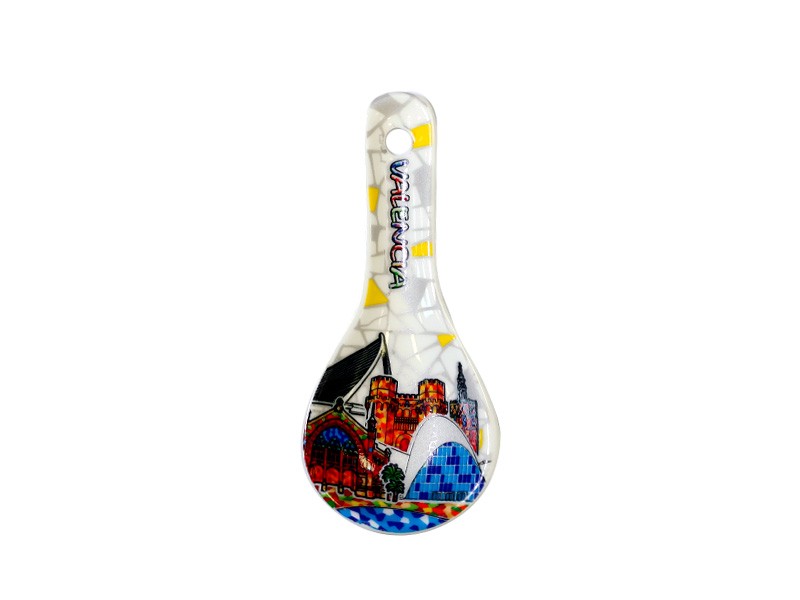 Ceramic magnet with a Valencia spoon design, a jewel that captures the essence of this vibrant city. This magnet, with its attractive spoon shape, stands out for both its functionality and its contemporary aesthetic. Its white base serves as a perfect canvas for the colorful illustrative details of the majestic Valencia Cathedral, famous for its impressive Gothic architecture, and the innovative City of Arts and Sciences building, an icon of modern design. The touches of color in the representation of these monuments contrast wonderfully with the background, creating a striking look that will enchant any visitor.