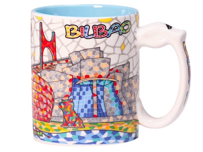 This ceramic mug is a splendid souvenir that captures the essence of Bilbao. With its 9.5 cm height, it’s perfect for enjoying your favorite drinks while admiring its vibrant design. The piece, decorated in white, stands out for its colorful representation of iconic city elements, such as the emblematic Puente Colgante and the innovative Guggenheim Museum, presented in a modern mosaic that combines cheerful and striking tones. The upper interior, in an attractive blue color, provides a fresh and original contrast to the design, making every sip a visual pleasure.