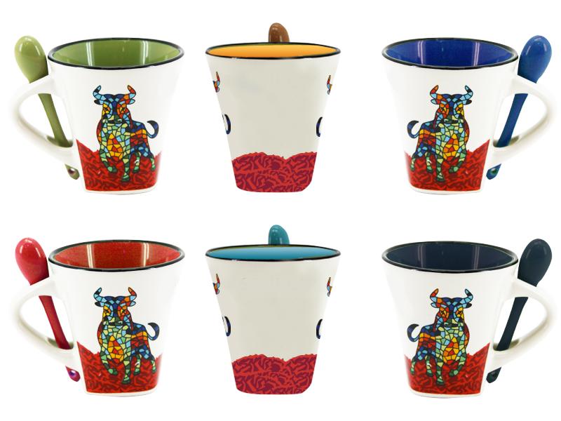 Beige ceramic mug, decorated with a vibrant mosaic bull symbolizing the rich Spanish bullfighting tradition. This artisanal, hand-painted design features red details on a white background, enhancing the bull’s figure with its colorfulness. The mug, with a green handle, is available with the interior in different color combinations, making it an attractive and functional item for any lover of Spanish folklore.