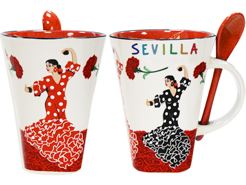 Ceramic mug with an elegant design that captures the essence of Sevillian flamenco. It features illustrations of two flamenco dancers dressed in traditional costumes: one in red with polka dots and the other in black, adorned with red roses. This item has a beige finish and red details on the rim, plus the word “SEVILLA” printed in a colorful style at the top. Ideal for enjoying your favorite drinks with a cultural touch.