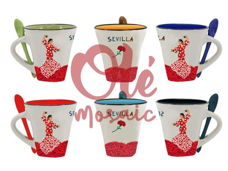 Discover this charming ceramic mug decorated with an elegant flamenco dancer, inspired by the vibrant Sevillian culture. Its design, in soft beige tones, stands out for the representation of the dancer dressed in an exuberant red ruffled dress that captures the essence of flamenco art. Next to the design, the word “SEVILLA” is adorned with a delicate carnation flower, symbolizing the Andalusian spirit and its rich cultural tradition. This mug is not only functional but also a work of art that celebrates the region’s flamenco heritage. Additionally, it includes a practical green spoon, which perfectly matches the aesthetic of the set, adding a touch of color and functionality. The luminous details adorning the mug add an air of sophistication and authenticity, making this item a prominent and representative souvenir of Seville. Ideal for tourists seeking authentic and quality souvenirs, this ceramic mug becomes a perfect gift that evokes moments lived in the city. At Olé Mosaic, we offer a wide range of ceramic souvenirs that highlight Andalusian culture, ensuring quality and care in every piece.