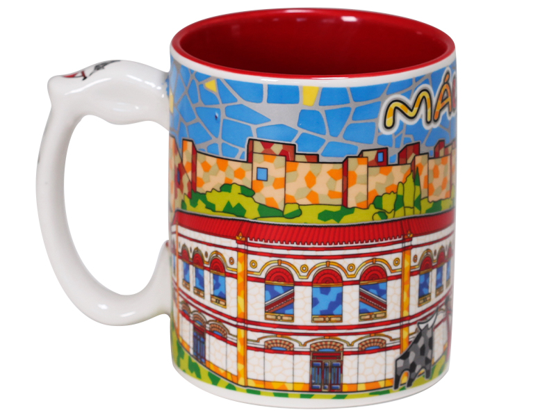 9.5 cm ceramic mug, decorated with a vibrant design that captures the essence of Malaga. This vessel features a colorful illustration of the iconic Bullring building, framed by a panoramic view of historic walls, all in blue and warm tones. The red interior complements the exterior design, which stands out for its mosaic-style technique, offering a touch of Andalusian culture to your home. Ideal for enjoying your favorite beverages with a piece of Malaga in every sip.