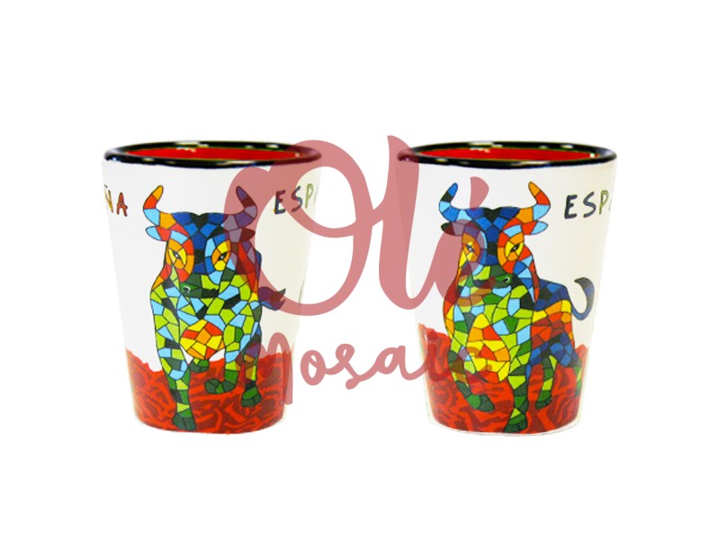Ceramic shot glass with a colorful bull design, an iconic symbol of Spain. This beige glass features a vibrant illustration of a bull decorated with mosaic motifs in green, blue, and red tones, against a backdrop of red flowers. The finish includes a black rim and the word “España” printed in clear letters, highlighting its cultural connection. Ideal for enjoying a shot or as a beautiful decorative accent.