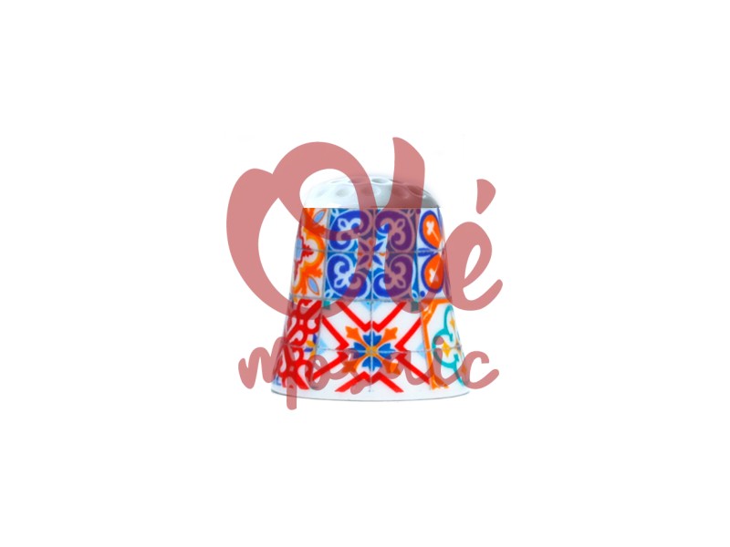 Ceramic thimble decorated with a charming mosaic of patterns in blue, red, and orange tones, representing Spanish artistic tradition. Ideal for collectors and sewing enthusiasts, this thimble, with its handcrafted, hand-painted design, evokes the rich cultural heritage and beauty of the country’s typical tiles. Its elegant shape and vibrant colors make it a unique and attractive souvenir.