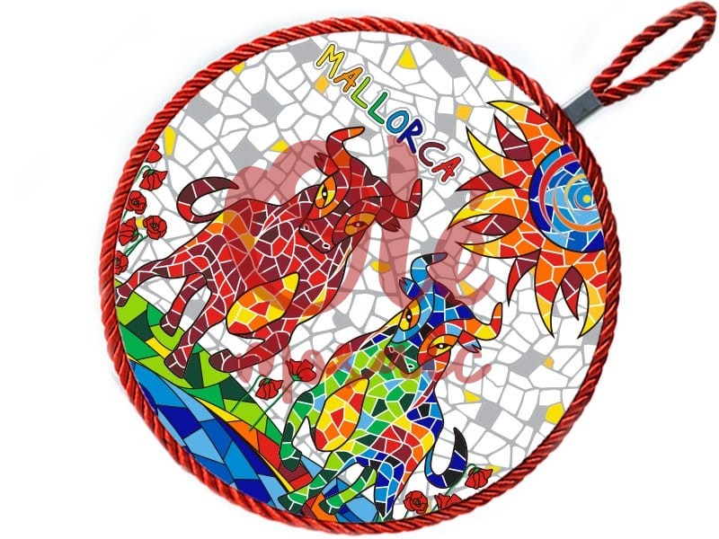 This ceramic trivet, with its vibrant bull design, is a unique piece that captures the essence of Mallorca and its rich cultural tradition. Made from high-quality ceramic, it features a colorful finish that blends a mosaic style with red, green, and yellow tones, evoking the joy and dynamism of Mallorcan festivities. In the center, two majestic bulls, symbols of strength and tradition in the region, stand surrounded by floral motifs that add a touch of freshness and local character.