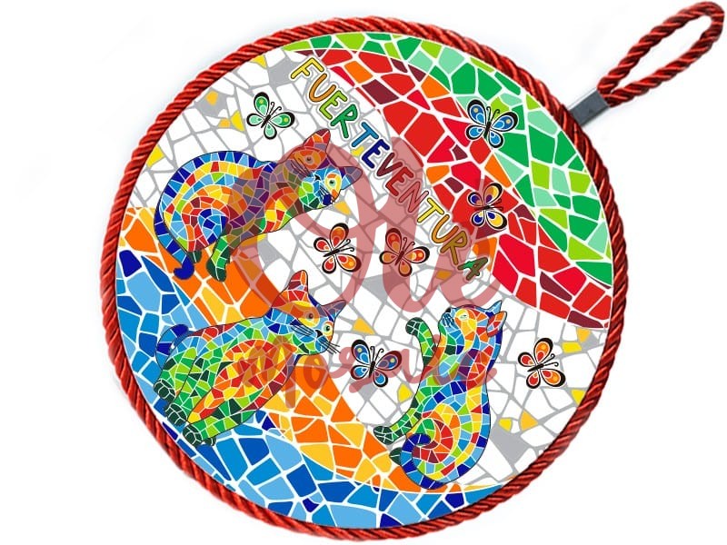 Ceramic trivet with a colorful design inspired by the charm of Fuerteventura. This product features a vibrant illustration of cats in a mosaic technique, complemented by decorative butterflies. The cats, represented in a variety of bright colors such as red, blue, and green, stand out against a dynamic background of geometric shapes that evoke the island’s artistic nature. At the top, the text “Fuerteventura” adds a distinctive element, ideal for adding an island touch to your table.