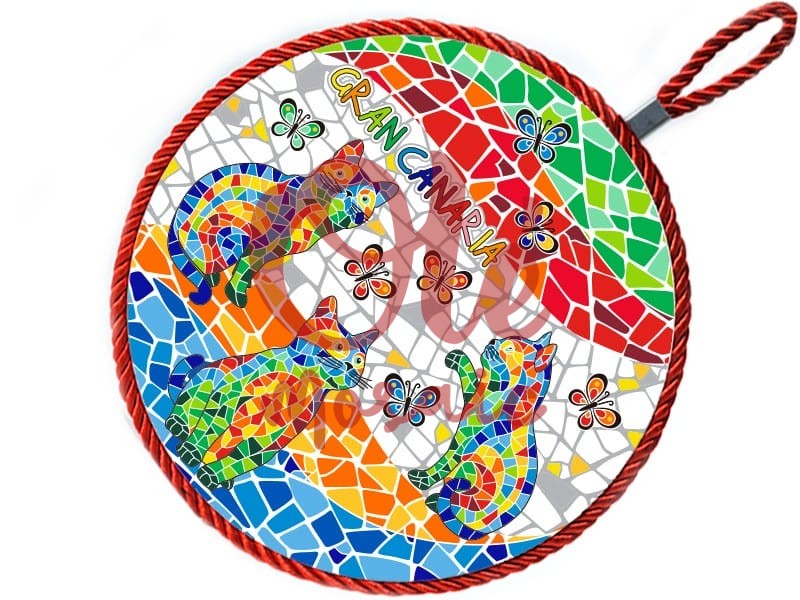 Ceramic trivet decorated with colorful cats, evoking the vibrant spirit of Gran Canaria. This trivet features a unique design combining bright mosaic colors with butterflies, adding a playful touch. The ceramic is bordered by a red cord, which adds a practical and aesthetic element. Ideal for protecting surfaces while beautifying any table with authentic Canarian style.