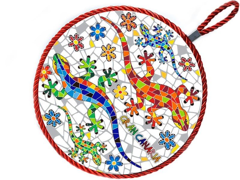 Ceramic trivet inspired by the fauna of Gran Canaria, decorated with colorful salamanders and mosaic flowers. This product features a vibrant and cheerful design, artisanal, hand-painted, in multiple shades of red, green, blue, and yellow, evoking the rich Canarian culture. With a ceramic finish and a braided edge, it is both functional and a decorative piece that will add a distinctive touch to any table, highlighting the spirit of Gran Canaria.