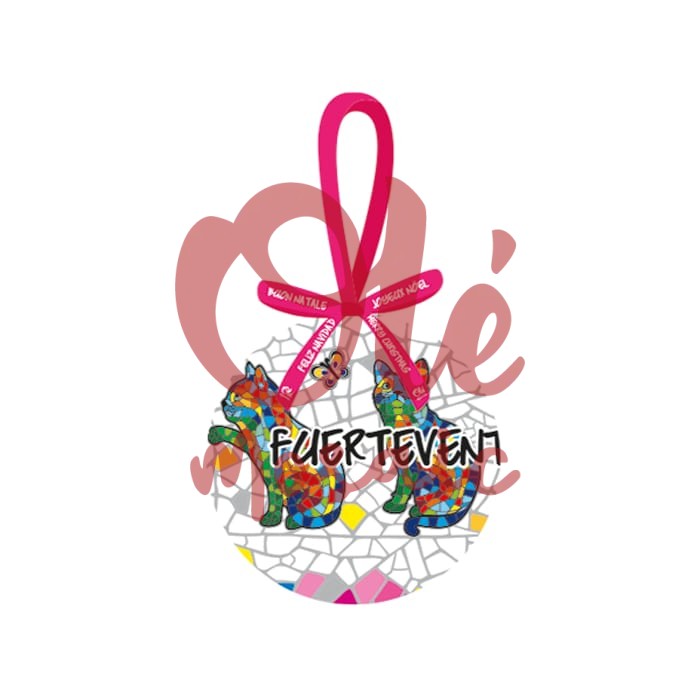 Christmas ball decorated with motifs of two colorful cats, inspired by the art of Fuerteventura. Crafted from ceramic, this charming ball features a vibrant design with colorful mosaics on a white background that highlights its originality. It sports a pink ribbon and the inscription “Fuerteventi” on the front, ideal for adding a festive and cultural touch to your Christmas tree. It comes presented in an elegant box, perfect for gifting.