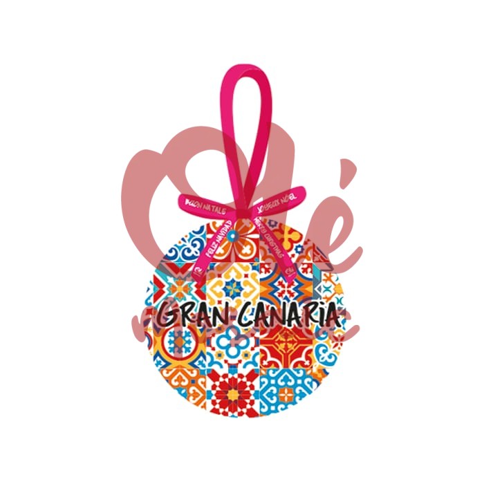 Decorative Christmas ball reflecting the vibrant mosaic of Gran Canaria. This attractive ornament, with a round design and made from high-quality materials, features an explosion of colors like red, blue, and yellow, with distinctive geometric patterns. It includes a gift box, and its pink ribbon adds a festive touch. Ideal for decorating the tree and evoking the Christmas spirit of the Canary Islands.