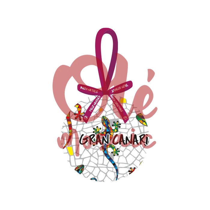 Decorative Christmas ball with a box, inspired by the fauna of Gran Canaria, featuring a cheerful design of multicolored salamanders. This ceramic piece, adorned with a mosaic background, presents the word “Gran Canaria” in striking black. Crowned with an elegant burgundy ribbon, it is ideal for bringing a festive and cultural touch to your Christmas decor, celebrating the charm and biodiversity of the Canary Islands.